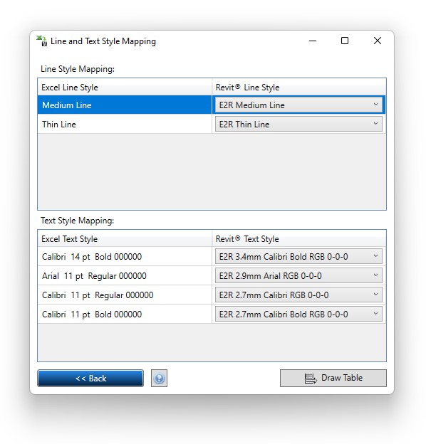 * **Use Text and Line Styles from Revit Project** – will open the Line and Text Style Mapping window to map Excel line and text styles to Revit line and text styles.
