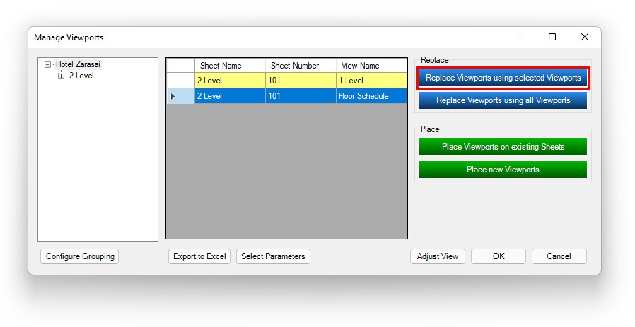1. Select existing views from the table that you want to replace and hit **Replace Viewports using selected Viewports.**