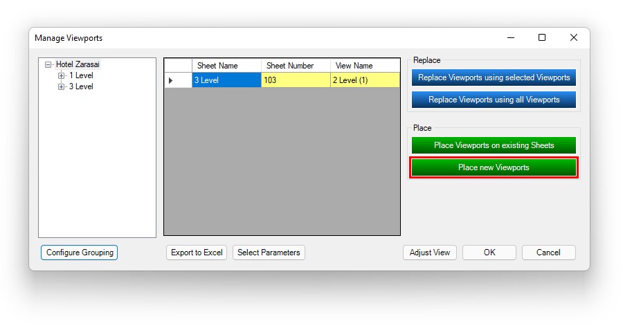 1. Select views that will be used as templates (for position) and hit the **Place new Viewports** button.
