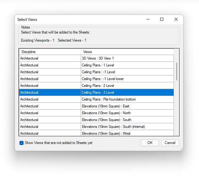 **Place new Viewports** functionality places views, that aren't placed on any Sheets, on selected existing Sheets.