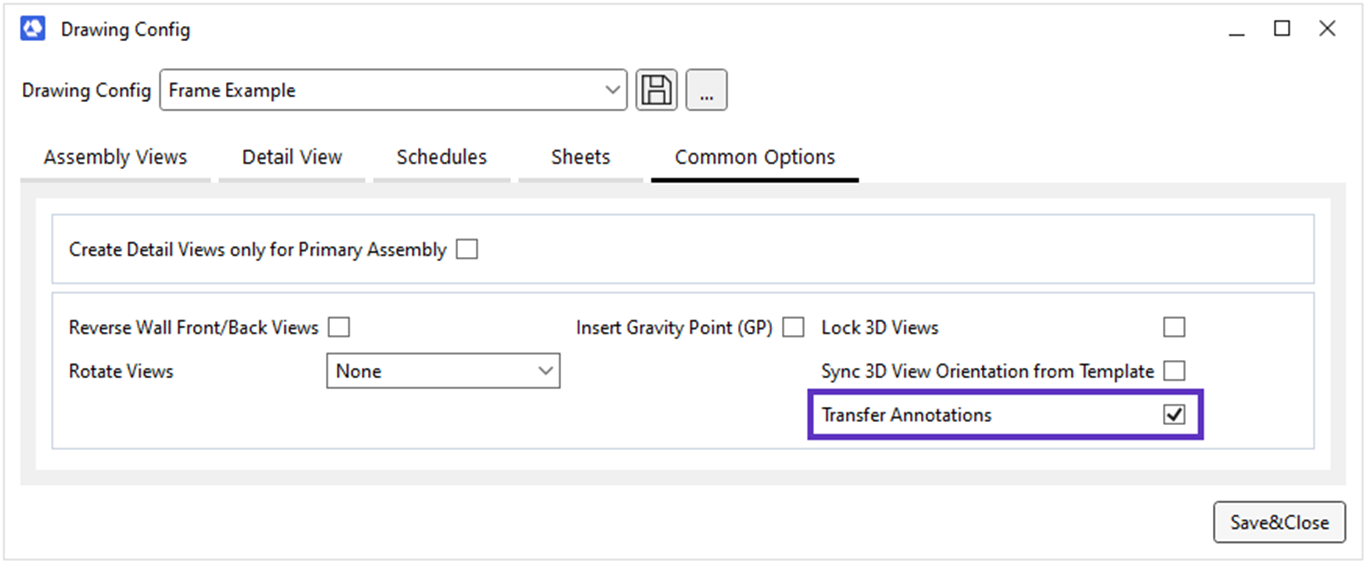 Note: Keep in mind that Generic Annotations, Text Noted, Detail Lines, and Secondary Title blocks can be transferred automatically using ‘Transfer Annotations’ in Drawing Config. It must be turned on so that when the Assembly is updated, Annotations will be transferred and/or updated: