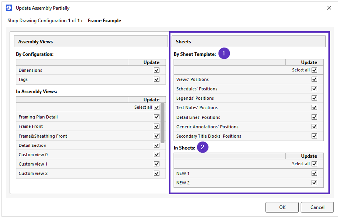 This is where Update Assembly Partially comes in handy. You don’t have to update all aspects of your existing assembly sheets according to the modified Sheet Template. You can select only those specific positions that you want to update; the rest will remain as they are (according to the original Sheet Template).