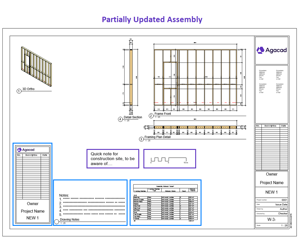 As a result of running Update Assembly Partially in this case, only the positions of Schedules, Legends, and Secondary Title Blocks are updated while those of Text Notes and Generic Annotation elements are unaffected (they remain in their original positions, as in the original sheet template):