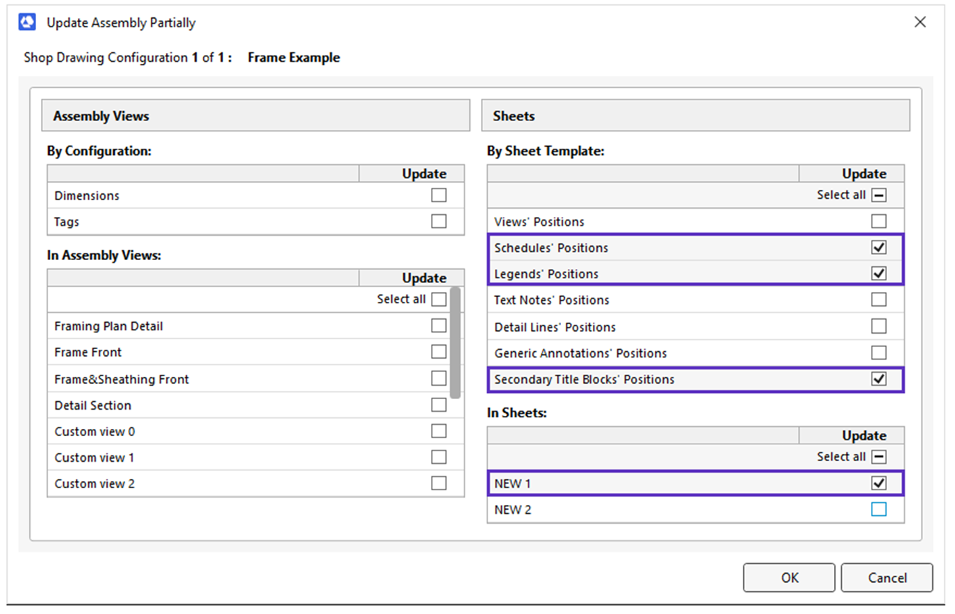 Update Assembly Partially – a feature that allows you to update specific aspects of an assembly, such as annotation, framing, views etc. Users can select which aspects of an assembly should be updated in the Update Assembly Partially window.