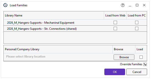 The first time you load families, you will need to download the library from the web. Tick the checkbox for your preferred library in the **Load from Web** column and click **OK**. Families will then be loaded into your Revit project.