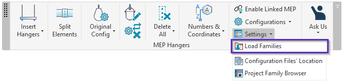 If you don’t see the **Load Families** button in the **Insert Hangers** window and still don’t have hanger families in your project, use the **Load Families** command in the **MEP Hangers** toolbar.