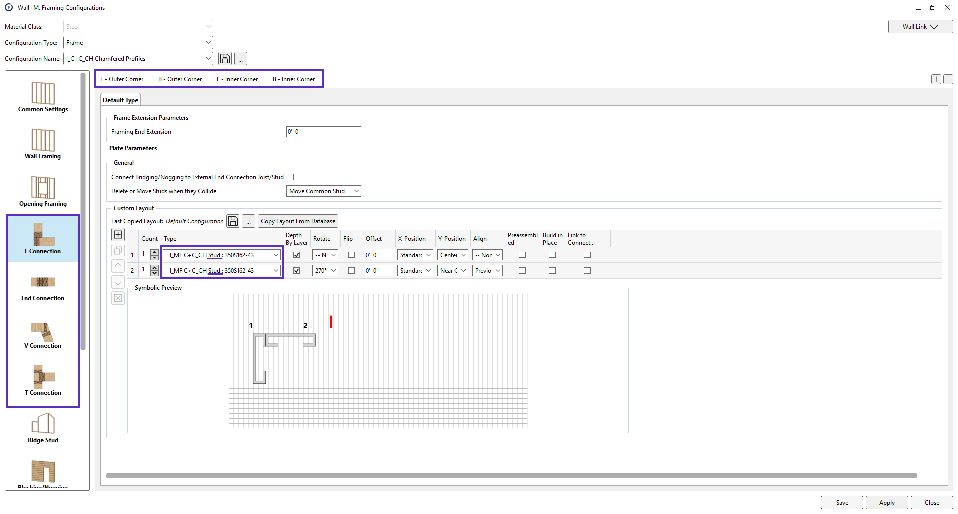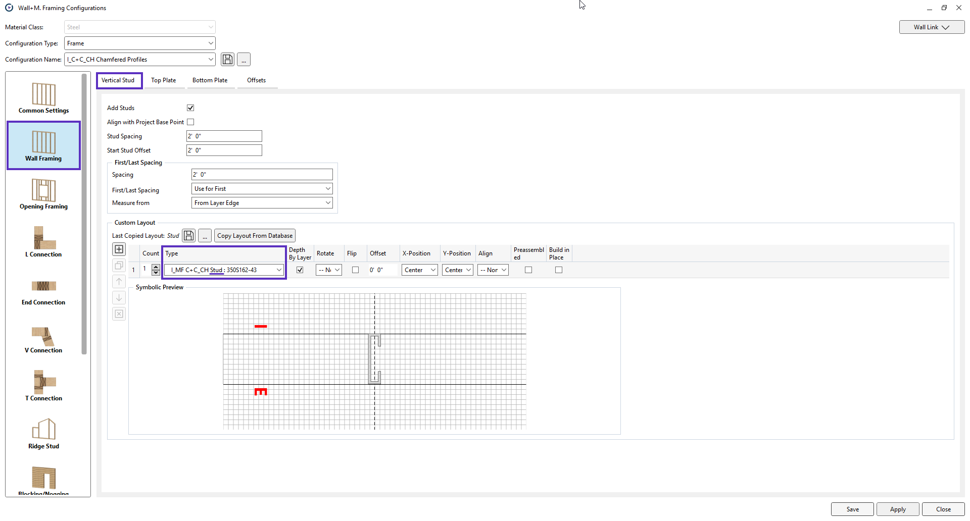 After you load Metal Framing default families (**Settings** > **Load Families** > **Main Families**), you should use the C+C\_CH families in the Framing Configurations: