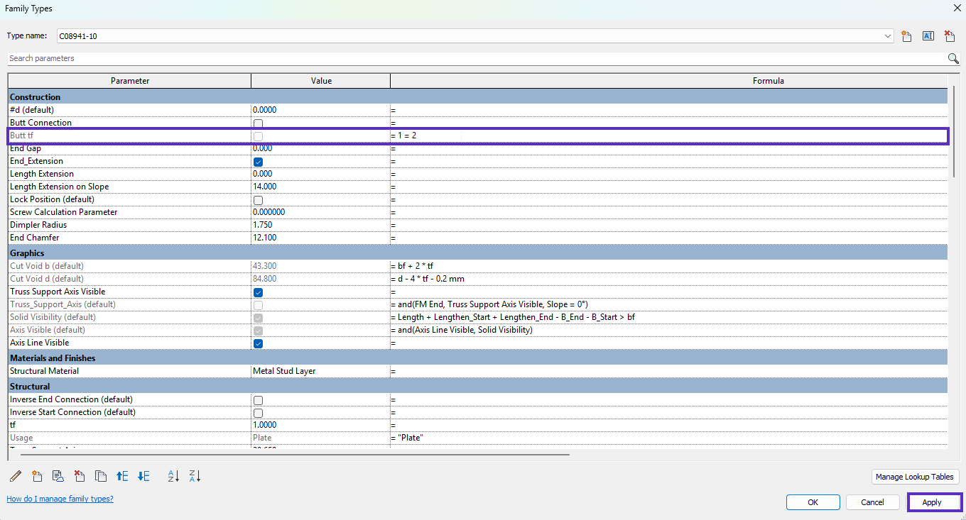 2. Replace the existing **Butt tf** parameter formula with the new value: