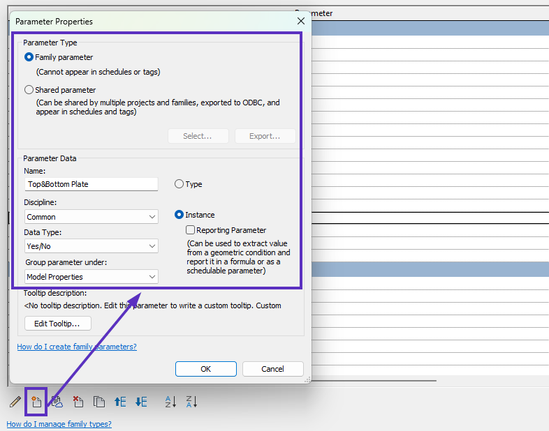 Create a new **Instance**, **Yes/No** parameter **Top\&Bottom** **Plate** and group it under **Model Properties**