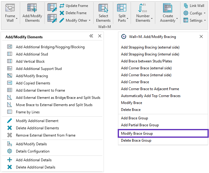 Add/Modify Bracing – features for adding/modifying braces between studs or plates, corner braces and brace groups.