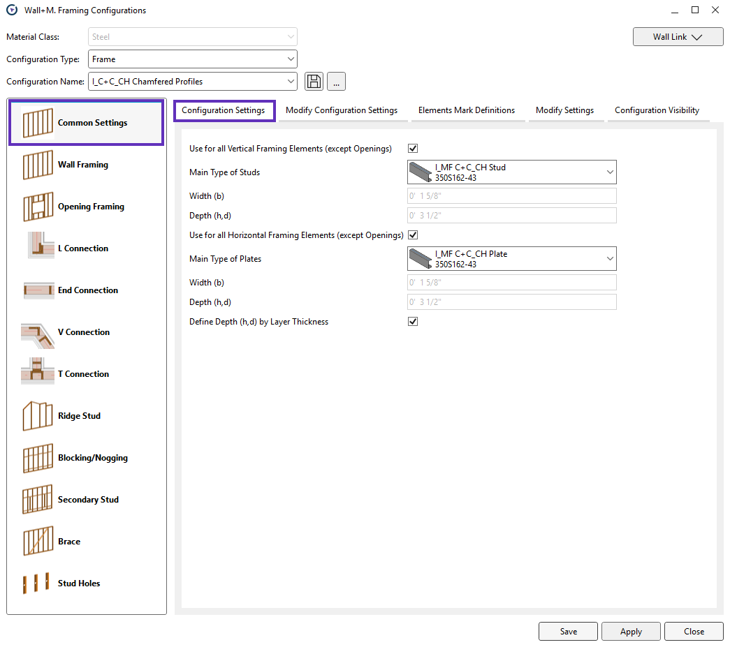 **Use for all Framing Elements (except Openings)** – if ON, then the selected Stud and Plate families will be used for other framing elements, like connections, bridgings, noggings, etc. without an option to change it to a custom family.