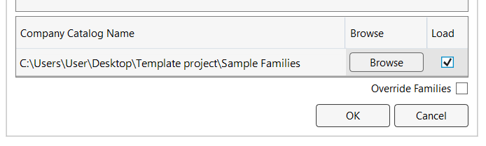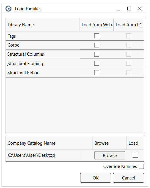 **Load Families** – This option allows you to select and load sample families into your current project. It provides a range of predefined Metric and Imperial families, including framing, columns, rebar, and tag families.