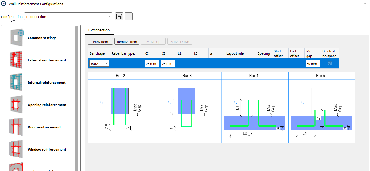 This functionality is designed for use with walls consisting of a single layer. It includes features that allow the automatic placement of chosen rebar shapes at T-type connections.