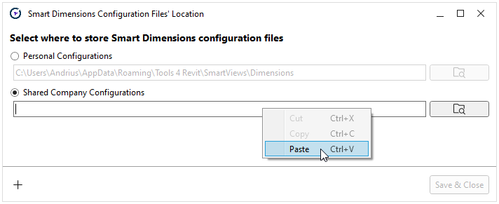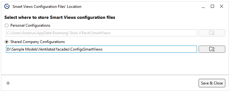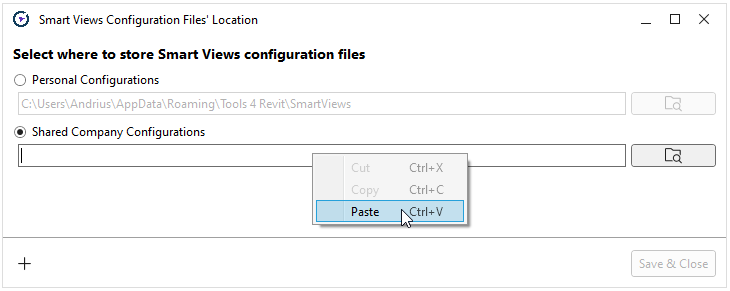 Open the **ConfigsSmartViews** folder and copy the file path name. Then go back to Revit and find the **Smart Views** tool. Open **Smart Views Configuration Files' Location**: