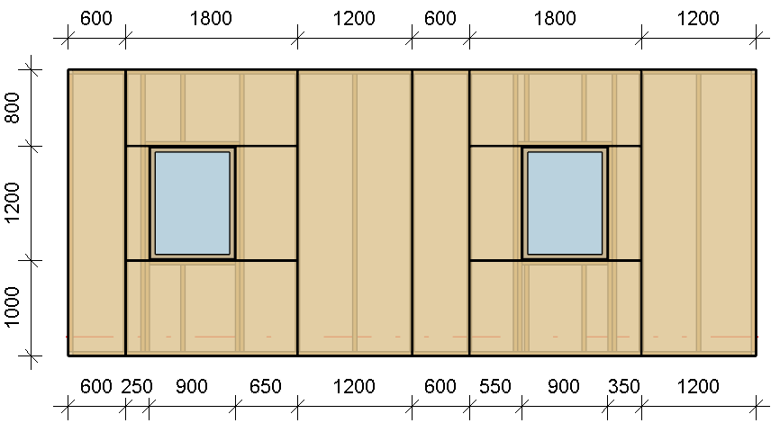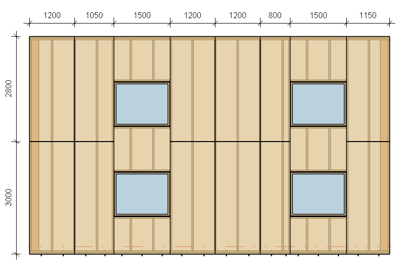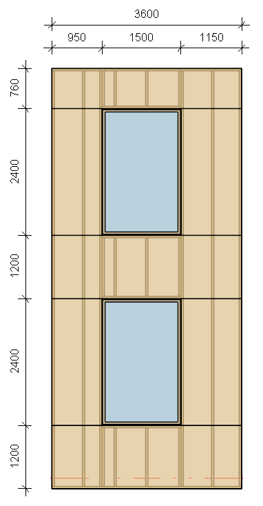 Also, we can predefine the paneling dimensions to 3000 x 1200 mm, split the paneling vertically, add horizontal splits and vertical splits on the nearest opening king, and set to horizontal prioritization for merging: