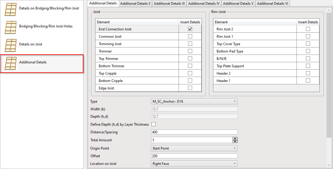 **Details on Bridging/Blocking/Rim Joist, Details on Joist** and **Bridging/Blocking/Rim Joist Holes** – different rules for placing details and holes.