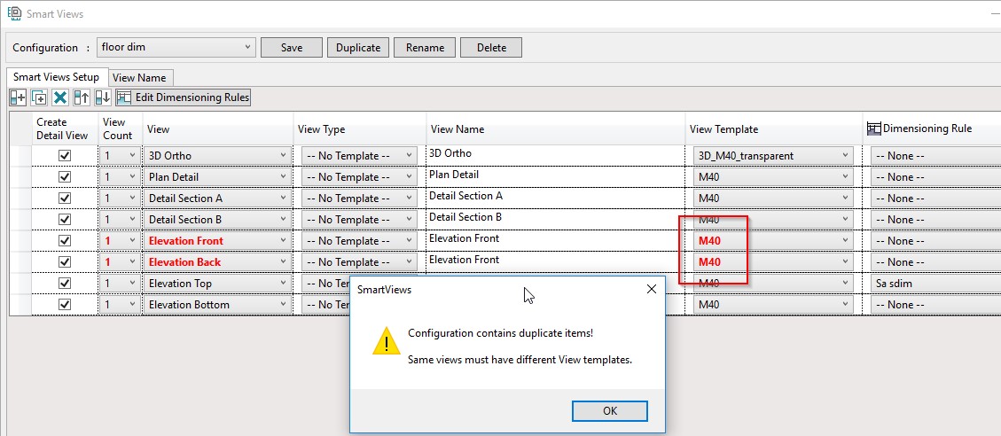 In Smart Views, it is not possible to have the same Type of Views, like Front, Top, etc. with the same View Templates. If you try to do that, you get this message:
