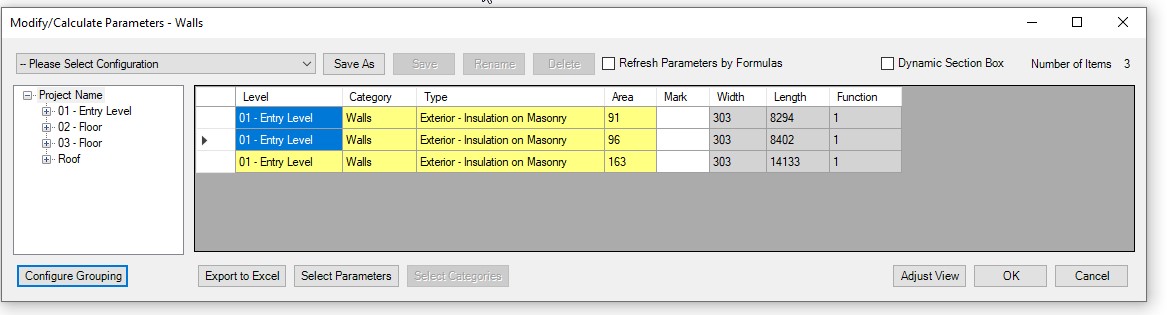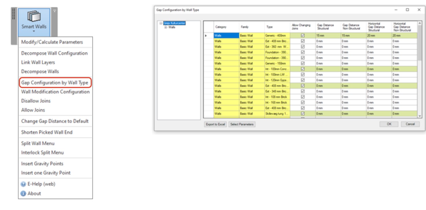 **Modify/Calculate Parameters** different type walls with one click. Selected wall group parameters can be modified independently.