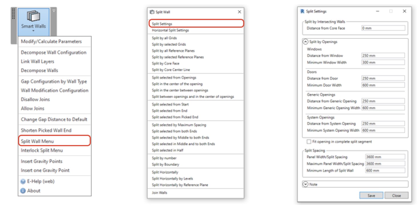 **Split Settings** - allows user to configure wall splitting by various rules. Split walls at exact locations by using grid lines, reference lines, boundaries, core faces, openings.