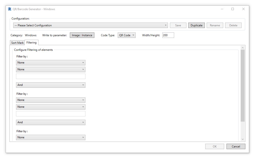 2. After selecting the category, you will be prompted with a window asking you to select a parameter where the new QR or barcode should be written. You can create a new shared parameter for the selected category, or use the built-in **Image** instance parameter.