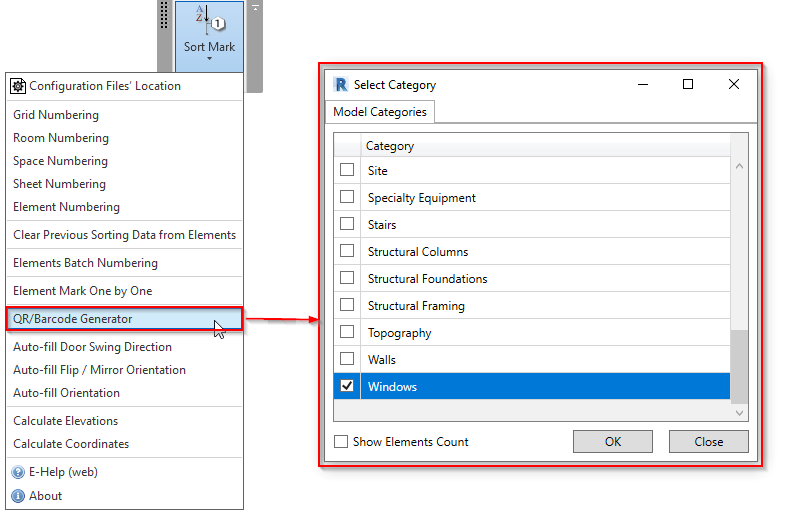1. First, determine which category of elements should get the QR or barcode. For this example, let's select the Windows category.