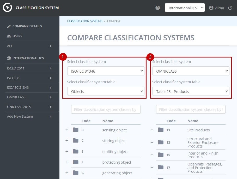 In the “Compare Classification Systems” window that opens, pick the systems and tables you want to compare – one on the left (1) and one on the right (2).