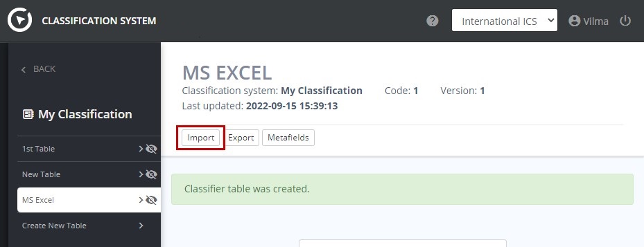 To begin, go to the “MS Excel” screen in the classification system where you want to add a table and click the "Import" button.